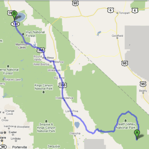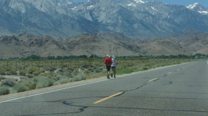 Onderweg komen wij aan onze kant van de weg wat auto’s tegen. Op deze auto’s zijn stickers geplaatst met wat nummers en namen. Aan de andere kant van de weg zien wij wat mensen lopen en soms rennen er ook een paar. Natuurlijk worden deze mensen door ons voor gek verklaard. Wie gaat er nou hardlopen/wandelen bij 38 graden, want zo warm is het nu ondertussen. Natuurlijk neemt onze nieuwsgierigheid de overhand en besluiten wij bij één van de auto’s te stoppen om te vragen wat er aan de hand is.  Ons wordt uitgelegd dat dit de Badwater marathon is. Deze marathon is 134 mijlen (215 km) vanaf Badwater, het laagste punt van de USA naar Mount Whitney, het hoogste punt van het vasteland van de USA. Zij zijn gisterochtend om 06.00 uur begonnen en mogen hier 48 uur over doen. Er doen 90 deelnemers mee en bij de eerste 100 mijlen (160 km) zijn er pas 4 uitvallers. Wij komen ook zeker twee mensen tegen die dit lopen met een kunstbeen. We komen heel de weg niet onder de 30 graden Celsius het is een ongelooflijk prestatie wat zij neerzetten. Bij Lone Pine nemen wij afscheid van deze runners. De jongere generatie slaapt en wij genieten van het uitzicht. De bergtoppen voor ons zijn bedekt met sneeuw wat een schitterend gezicht is, vooral omdat wij nog door het droge landschap rijden.