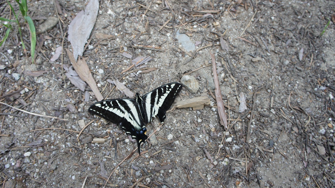 Wij lopen verder de heuvel op en zien een heel leuk huisje, een man is hier hout aan het hakken, de schoorsteen rookt, het is echt een idyllisch plaatje. Dit blijkt het museum te zijn. Op het pad zien wij een mooie vlinder liggen. Ze leeft nog wel maar mist wel een deel van haar vleugel. Er komen heel veel vlinders voor in Mariposa Grove, vandaar ook deze naam. Mariposa betekent in het spaans vlinder.