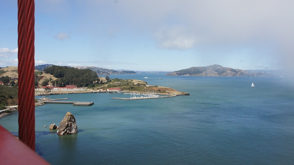 We rijden nog een tijd langs het water en hoe dichter we bij de Golden Gate komen, hoe grijzer en bewolkter het wordt. Nee he, dat hebben wij weer, gisteren een schitterende dag, Golden Gate lag er hartstikke mooi bij. Vandaag zag je heel de brug niet. De brug werd bedekt door een wolk.