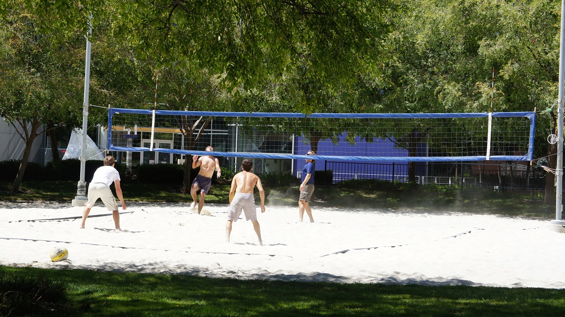 Hier hangt een hele relaxte sfeer. Leuke fietsjes voor de ingangen. Deze fietsjes gebruiken ze om van het ene gebouw naar het andere gebouw te komen. Ze staan niet op slot. Je kunt er gebruik van maken en dan weer laten staan voor de volgende. De medewerkers eten wat, relaxen wat, werken wat en spelen beach volley. Er hangt echt een heel ontspannen sfeertje.