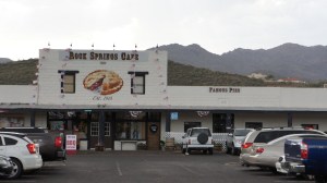 Wij vervolgen onze weg en stoppen natuurlijk nog even bij Rock Springs Cafe, wij hadden het advies gekregen om hier even te stoppen foto’s te maken met de Saguaro’s, jullie weten wel die tekenfilm cactussen en dan even bij Rock Springs Cafe een pie te gaan eten. Koffie was niets maar onze apple pie was