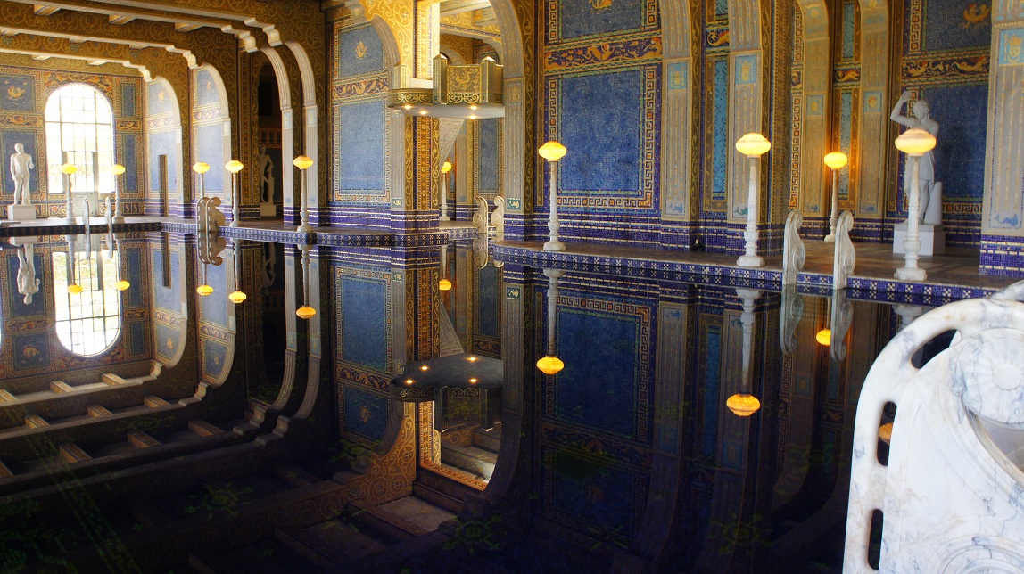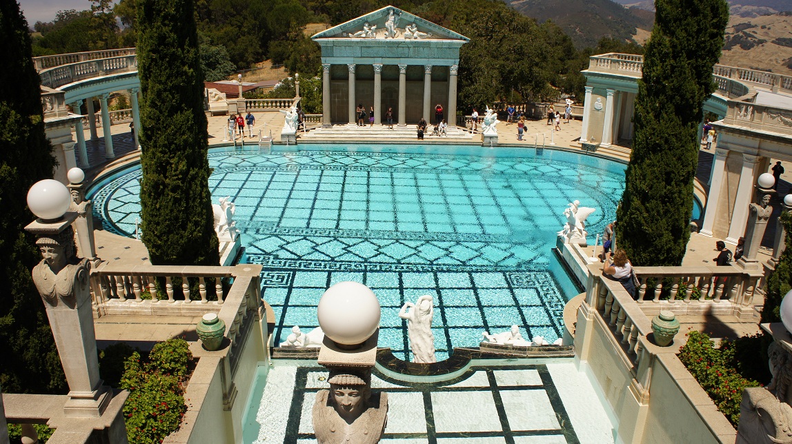 San Simeon is vooral bekend om Hearst Castle. William Randolph Hearst was een rijke krantenmagnaat in Californië, hij gaf in 1919 de opdracht om een bescheiden buitenhuis op een heuvel te bouwen. Het ontwerp breidde zich onder de invloed van de opdrachtgever alsmaar uit. Hij heeft 28 jaar lang aan het huis gebouwd en verbouwd. In de jaren ’30 van de vorige eeuw kwam hij financieel in noodweer terecht waardoor het niet helemaal af is. De Hearst Castle Foundation is het ook niet van plan om het af te maken. Zij willen het houden in de staat zoals William R. Hearst het achterliet. Onze gids George kon heel aardig vertellen en het was zeker heel erg leuk om door de slaapvertrekken, badkamers en bibliotheken rond te wandelen.