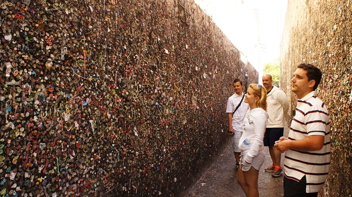 En – jahaa ze hebben nog meer in San Luis de Obispo – als enige hebben zij een straat vol met kauwgom!!!  Ze noemen het ook de  –  Bubble Gum Alley. Een voetgangersgebied in downtown, tussen Garden en Broad Streets bij Higuera Street. Sinds de jaren vijftig plakken de jongeren van de stad hun namen en andere informatie op de muren met kauwgum en niet met verfbussen.