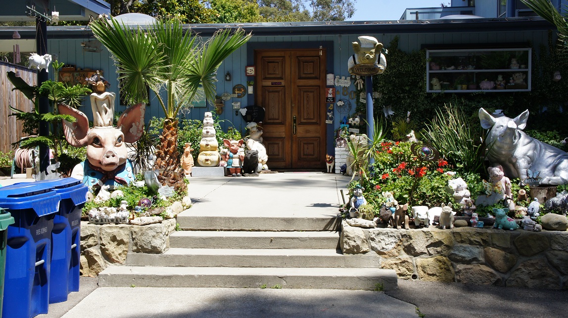 We rijden verder en komen langs het Pig House. Dit huis is van een oud politieagent. In de USA worden politieagenten ook wel pigs genoemd. Bij z’n pensionering kreeg hij van z’n collega’s een varkentje als afscheid cadeau. Dit is het begin geworden van een interessante collectie varkens.