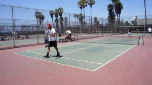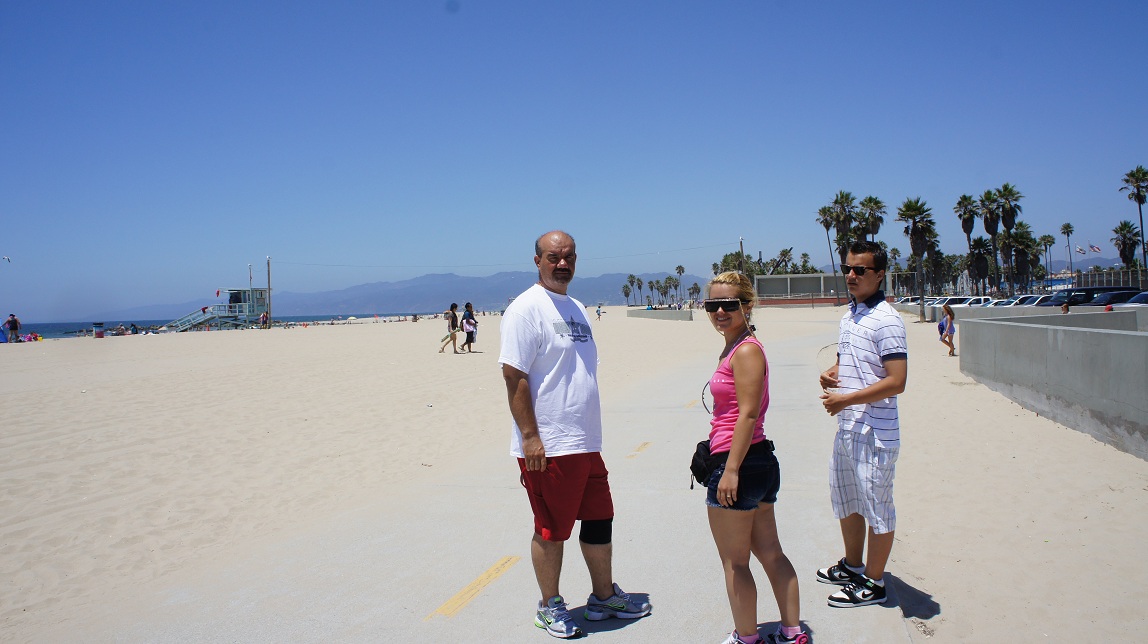 Er is van alles te beleven op Venice Beach. We lopen door tot aan Muscle Beach. Op Muscle Beach kijken wij naar mensen die met een groot tafeltennisbadje en een tennisbal op een klein tennisveld aan het tennissen zijn. Volgen jullie het nog. Het is wel heel leuk om te zien. Car vindt het helemaal geweldig, pingpongen op een klein tennisveld, allemaal effectballetjes, hij weet zeker dat hij Gos en Ang alle hoeken laat zien. Hahaha Hij ziet het helemaal zitten. Er is op het strand een sportschool waar wat mensen bezig zijn met gewichten. Het is echt een gezellige drukte.