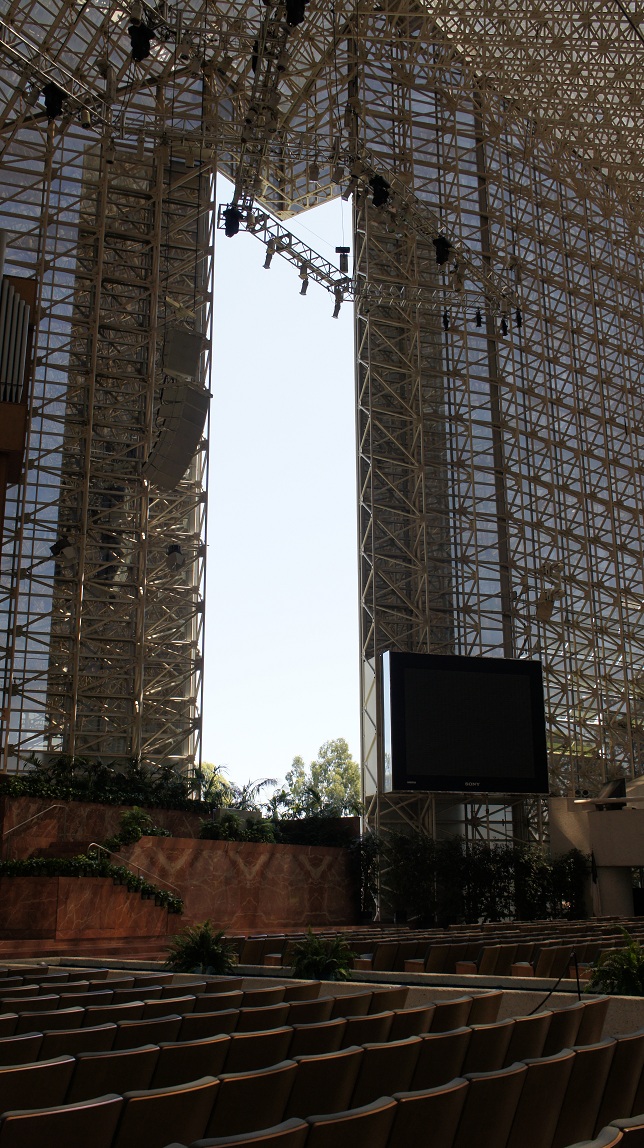 Crystal Cathedral is eigenlijk zoals de naam al zegt, een kerk die helemaal van glas is gebouwd. De kerk is heel erg groot en heeft hele mooie beelden in de tuin. We lopen over een pad met allemaal geschreven tegels met verzen uit de bijbel en daaronder namen. Wij vragen ons af waarom deze tegels hier liggen. We lopen de kerk binnen, de inrichting van de kerk vind ik een beetje sober. Geen beelden of schilderingen, er is wel een orgel en grote plantenbakken. Er zijn geen houten banken zoals bij ons in de kerken, nee, hier hebben zij comfortabele stoelen, alsof je in het theater zit. Het is alleen niet rood maar beige bekleed. Het is echt groot en je kunt hier heel wat mensen kwijt.