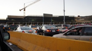 Nadat we ingecheckt zijn en alles op de kamer achter laten rijden we door naar het zuiden, we willen wel heel graag de grens met Mexico zien. We gaan niet de grens over, want dat mag niet van onze autoverhuur maatschappij. We kunnen wel parkeren en lopend de grens over steken. Parkeren kost $ 8,– voor de hele dag of een deel daarvan. We rijden het parkeerterrein op, we pakken ons kaartje uit een echte stempelmachine, we glimlachen wat naar de man met de stempelmachine, laten de auto staan, en wandelen richting grensovergang.