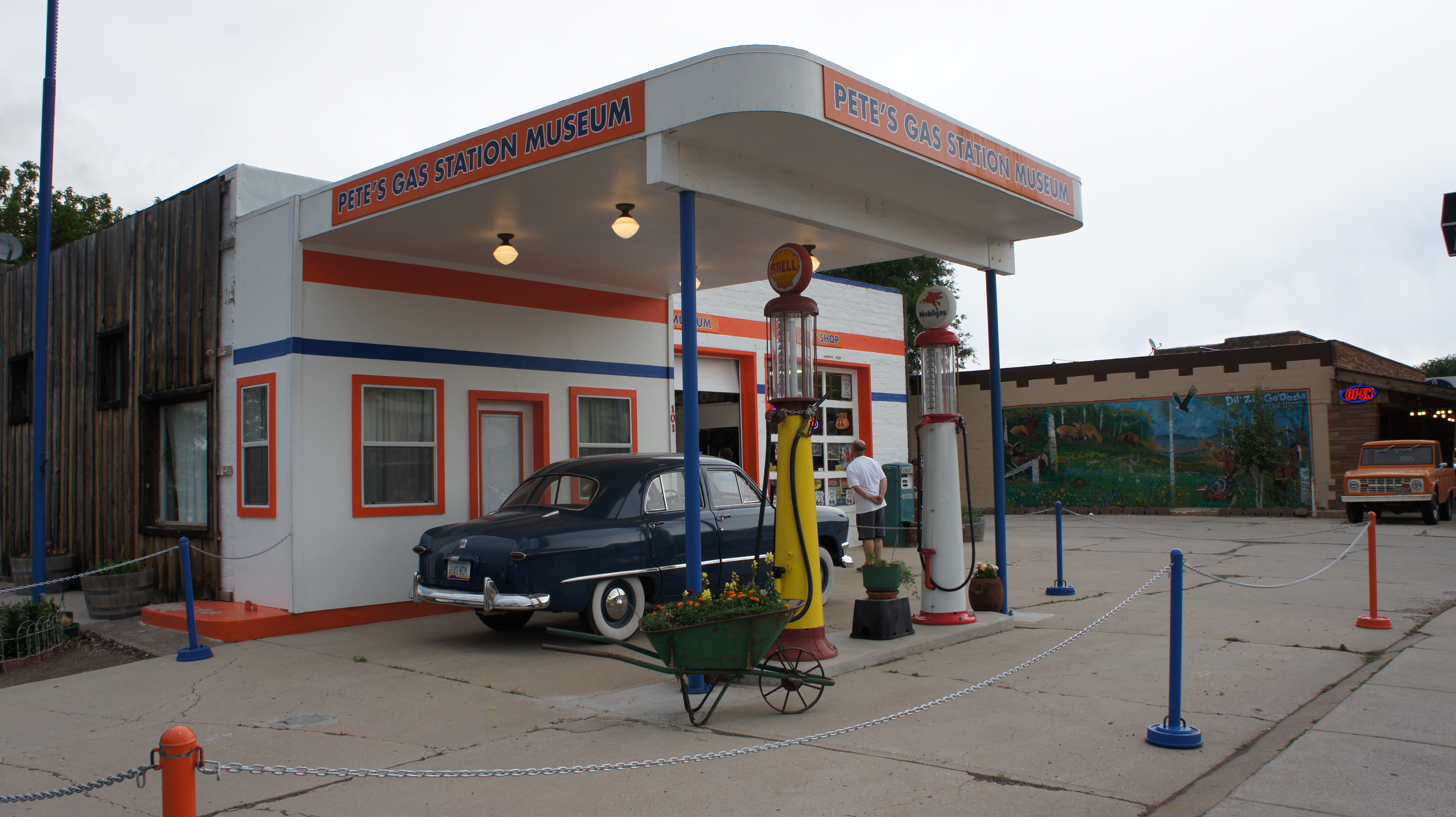 Wij hebben hier het gevoel alsof we de tekenfilm Cars binnenstappen. Deze garage is zo herkenbaar uit de film. Tussen de deur staat een auto uit 1927, de werknemer van de garage vertelt ons dat deze auto nog rijdt ook. Hij vertelt ons ook dat de makers van de film Cars hier twee weken hebben rondgekeken en foto’s hebben gemaakt voor de film. Na heel wat foto’s geschoten te hebben lopen we door en komen een bezinepomp tegen, ook deze doet ons heel sterk denken aan Cars. De eigenaar is wat voorzichtiger met zijn uitspraken of deze pomp het voorbeeld is voor de film, want er schijnen nog meer pompen hetzelfde te claimen.