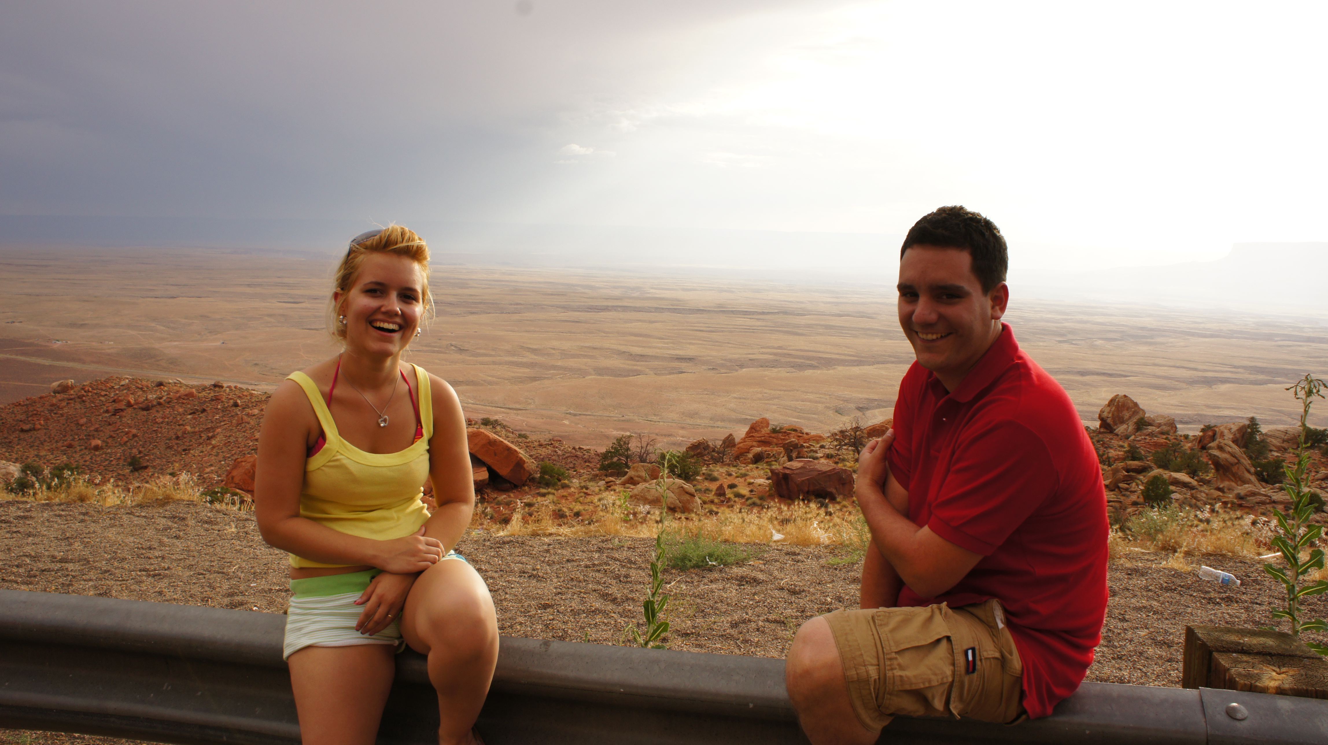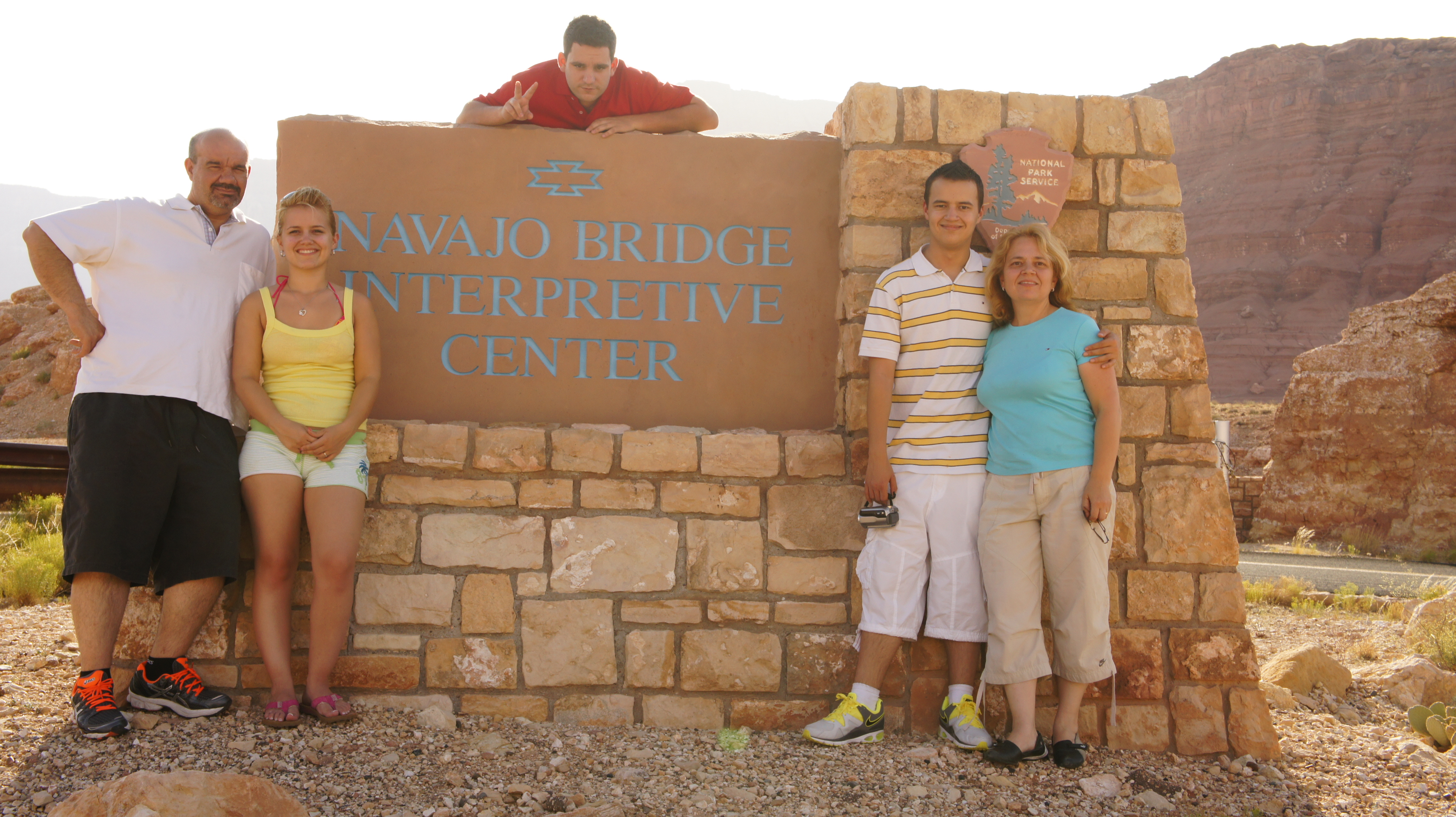 Na Cameron rijden wij verder in noordoostelijke richting naar Page, waar we onderweg even langs de Navajo Bridge moeten. Ik zal even uitleggen waarom wij over de Navajo Bridge moeten rijden. Hemelsbreed is het van de South Rim naar de North Rim maar 16 kilometer. Aangezien wij niet kunnen vliegen is de kortste weg voor ons om het lopend te doen, want dan is het maar 34 km. Zo’n 1600 meter dalen en dan weer klimmen aan de noordzijde, ach dat was het probleem niet, dat lukt ons wel want wij hebben voor de vakantie veel gelopen om conditie op te bouwen. Het probleem was……….. we moesten over een smalle hangbrug om de Colorado Rivier over te steken. Deze brug hangt op 21 meter hoogte, dat is vrij hoog vooral als je hoogtevrees hebt. Zij hadden tenslotte vandaag al gevlogen en angsten overwonnen. Dani, Ang en ik hadden het graag gelopen maar we zijn solidair en blijven bij Car en Ro.