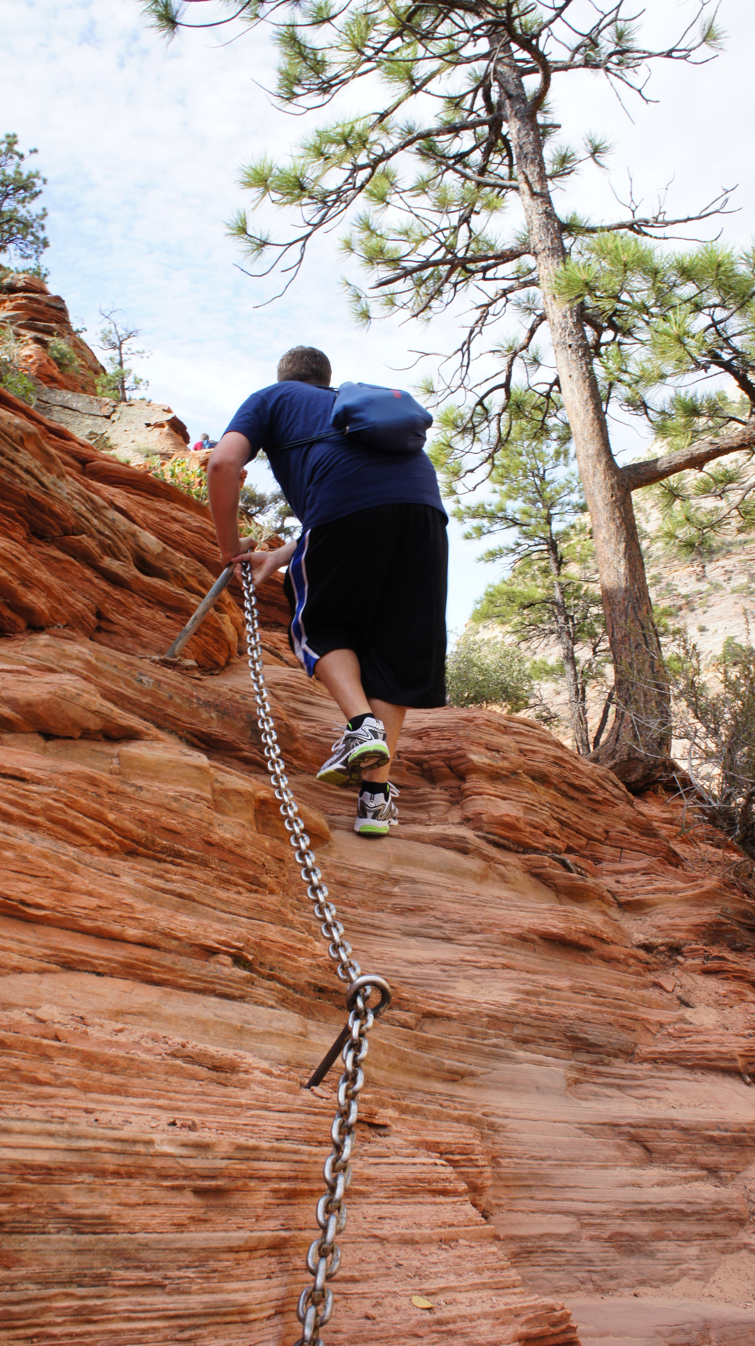 Voor ons zien we nu het begin van het laatste deel van de wandeling, een rots waar je met behulp van enkele kettingen omhoog kunt klimmen. Rechts ligt een diepe afgrond. Ik had al gelezen op www.ontdek-amerika.nl dat mensen met hoogtevrees hier normaal gesproken afhaken.
