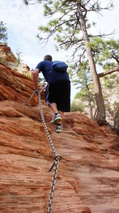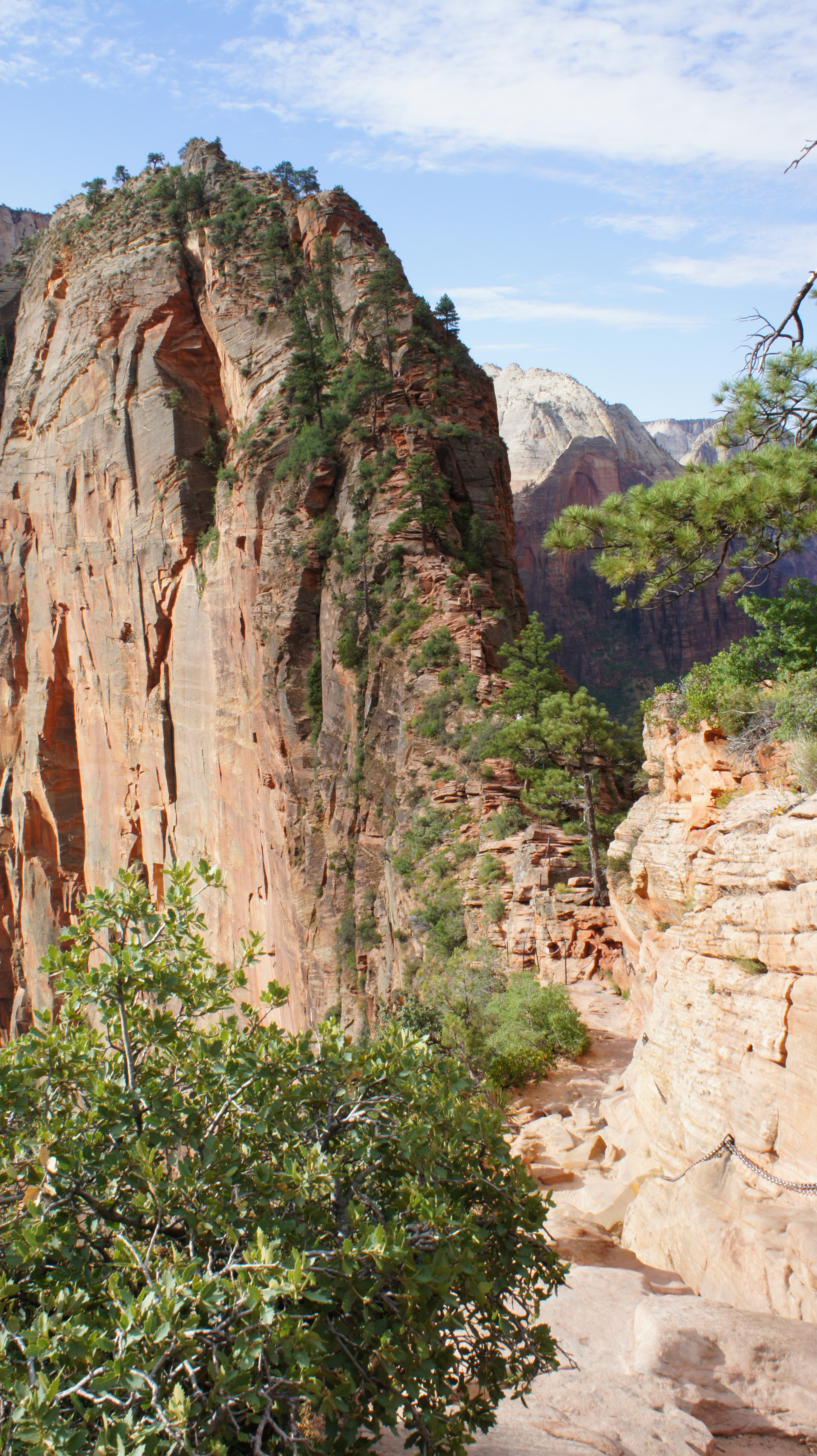 Ik ga alleen verder. Na de eerste klim langs de kettingen ga ik weer een stuk naar beneden. Dit is balen omdat ik weet dat ik deze meters zo dadelijk weer omhoog moet, de top is echt een heel stuk boven mij. Vervolgens kom ik uit bij een smalle bergkam die uit hobbelige platte over elkaar gestapelde stenen bestaat, met links en rechts van me diepe afgronden. Het laatste stuk ging ik opnieuw met behulp van kettingen nog een flink stuk omhoog; Tijdens de laatste 800 meter van deze wandeling heb ik 150 meter boven het niveau van Scout’s Overlook geklommen.