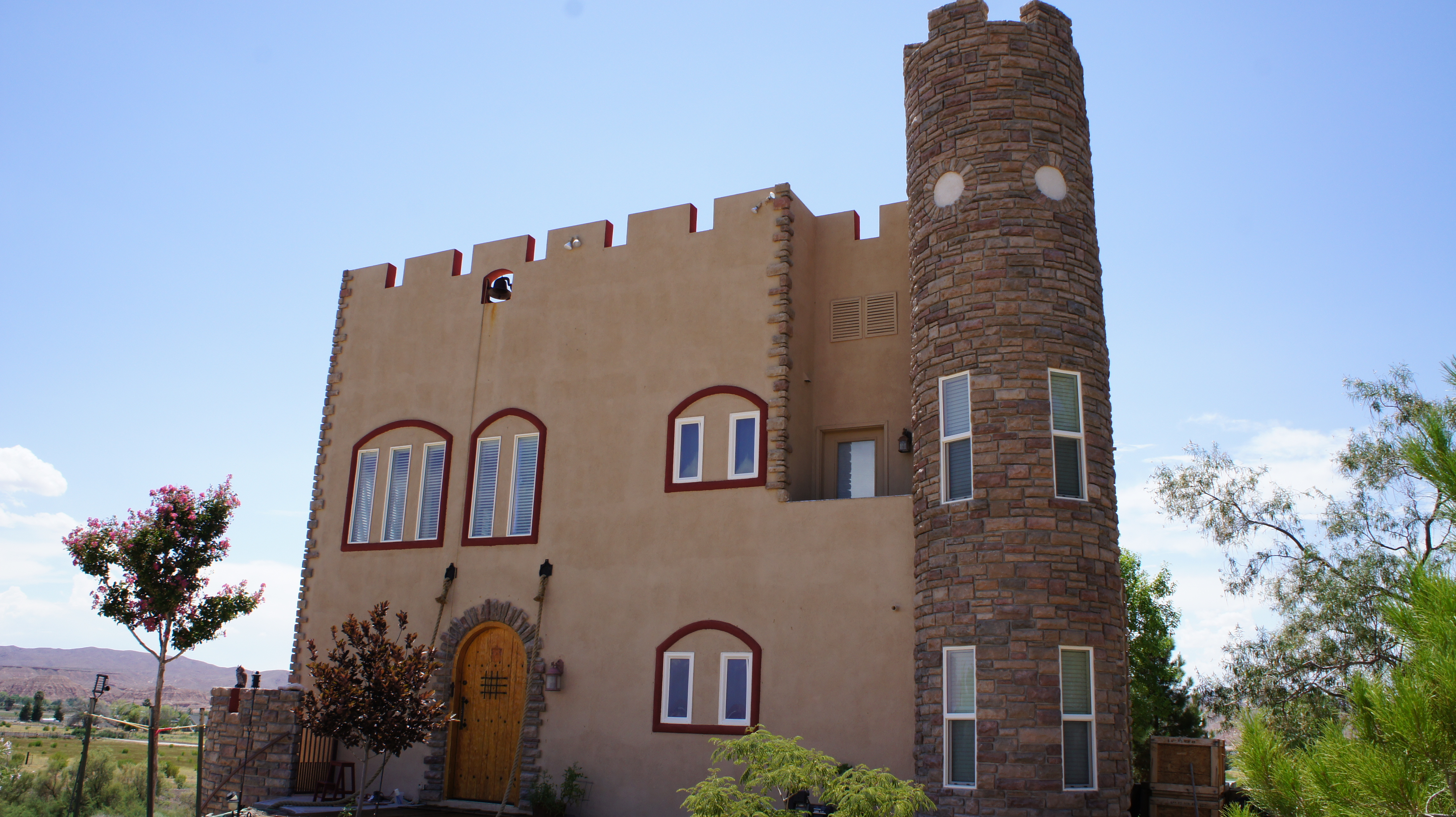 Het bord van onze derde staat hebben we jammer genoeg niet vast kun leggen op de gevoelige plaat. Wij zagen wel het bordje van de Stateline maar geen groot bord van de staat Nevada. Onderweg komen wij in woestijngebied nog heel wat mooie huizen tegen, waarvan er één wel heel erg opvalt. Het is een woning die nog in constructie is, maar zoooooooooo leuk. Het is een kasteeltje. Met ophangbrug, een grote bel, een uil die alles scherp in de gaten houdt en een toren. Het kasteel is echt zo leuk. Natuurlijk moesten wij dit even vastleggen op de digitale plaat. We kunnen niet te lang blijven hangen want de warmte is echt niet te harden.