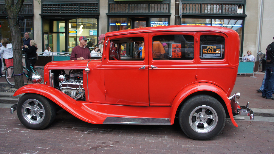 Nadat we wasmiddel gekocht hebben hebben we een paar rondjes gereden op Monument Circle. Er stonden wat leuke auto’s geparkeerd, zoals Lamborghini’s, Ferrari’s, Porsches en American Muscle Cars. Ook stonden er twee Hot Rods waarvan één te koop stond.