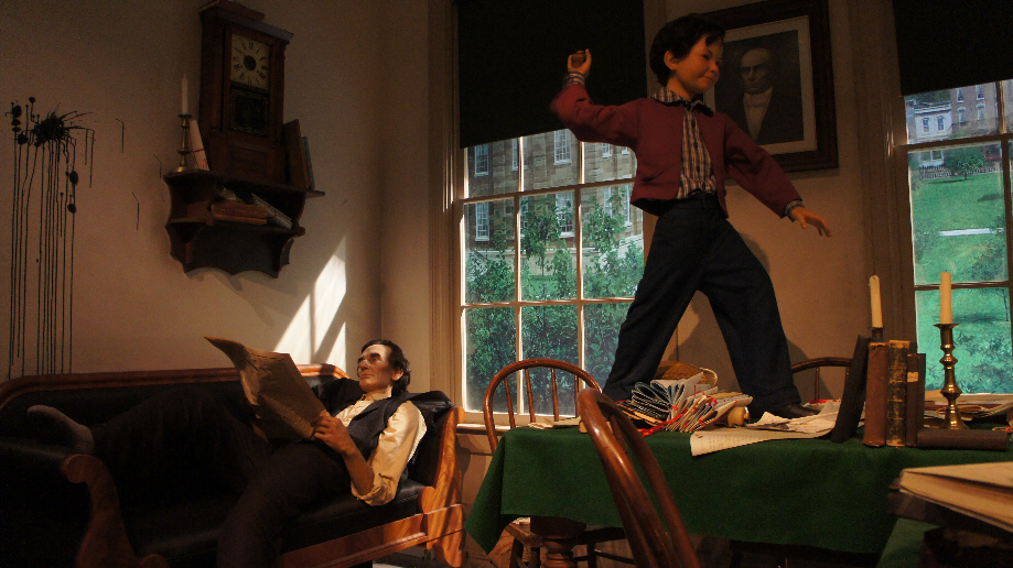 Er wordt ons meerdere malen op het hart gedrukt dat we geen foto’s mogen maken binnen in de gebouwen van het museum. Ik ben ondeugend geweest en ik heb toch een paar foto’s stiekem gemaakt. We beginnen bij de jonge Lincoln, in het huisje waar hij is grootgebracht, waar ze met z’n zevenen gewoond hebben. Hij heeft maar twee jaar onderwijs gehad en hierna moest hij zijn vader helpen. Hij heeft zichzelf onderwezen. Later is hij toch advocaat geworden, ook dit heeft hij op eigen kracht gedaan en is hij nooit onderwezen. Als ze aan Abe vroegen wat hij aan het lezen was dan antwoordde hij dat hij aan het leren was voor advocaat.