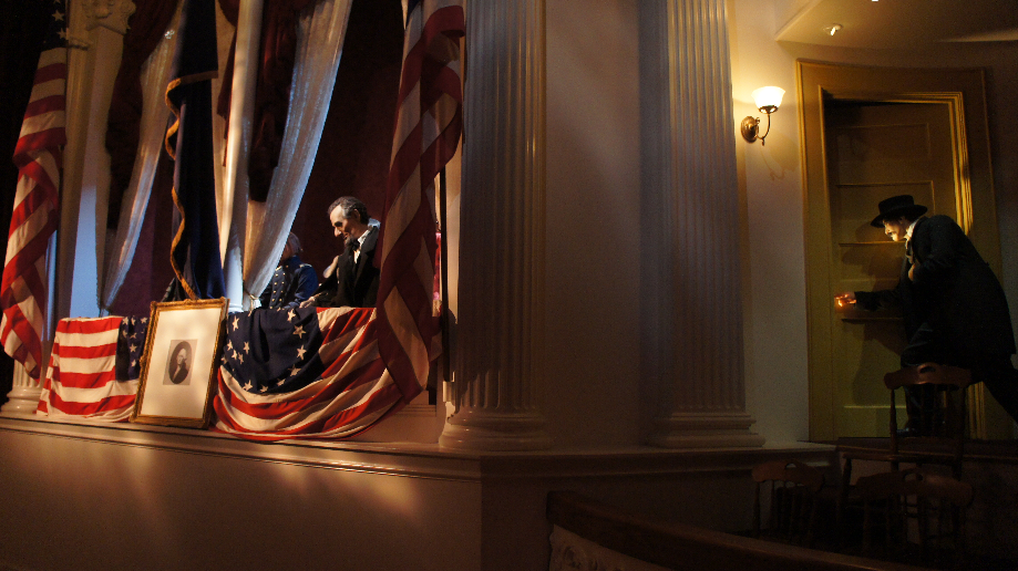John Wilkes Booth betreed het balkon in het Ford Theater waar hij een kogel door het hoofd van Abraham Lincoln schiet