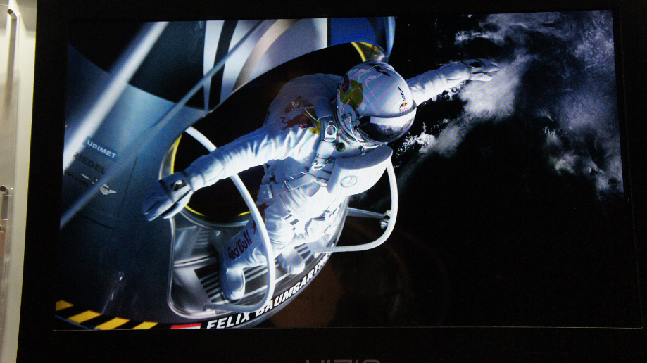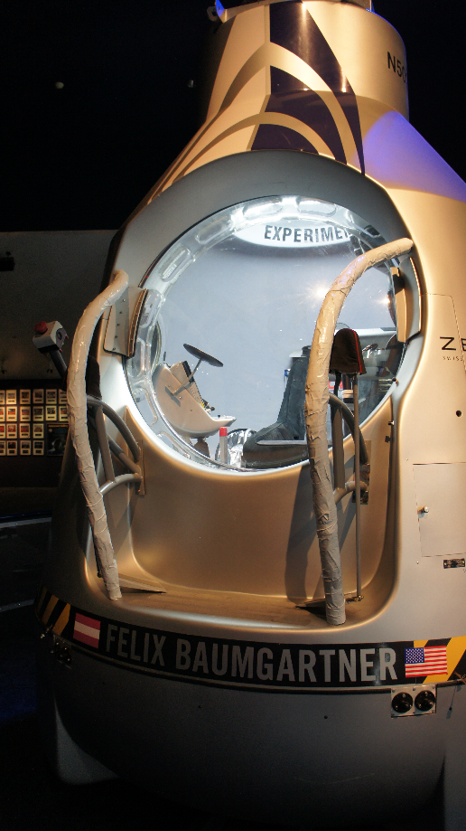 Wij bekijken wat ruimtepakken, we zien hoe de zonnepanelen op het ruimtestation werken en we kunnen een shuttle van binnen bekijken. Allemaal heel erg interessant, maar de meeste tijd brengen we door bij de sprong van Felix Baumgartner. Hij heeft meer dan 2500 sprongen op zijn naam staan, maar de bekendste sprong van allemaal heeft hij afgelopen 14 oktober gesprongen vanaf 38.969 meter hoogte. Met een maximale verticale snelheid van 1.357,6 km per uur valt hij richting aarde. Hij is de eerste mens die de supersonische snelheid bereikt in een vrije val. De capsule waarin hij zat staat hier, we kunnen niet ontdekken of het een kopie is of de originele, maar dat maakt voor ons op zich niet uit.