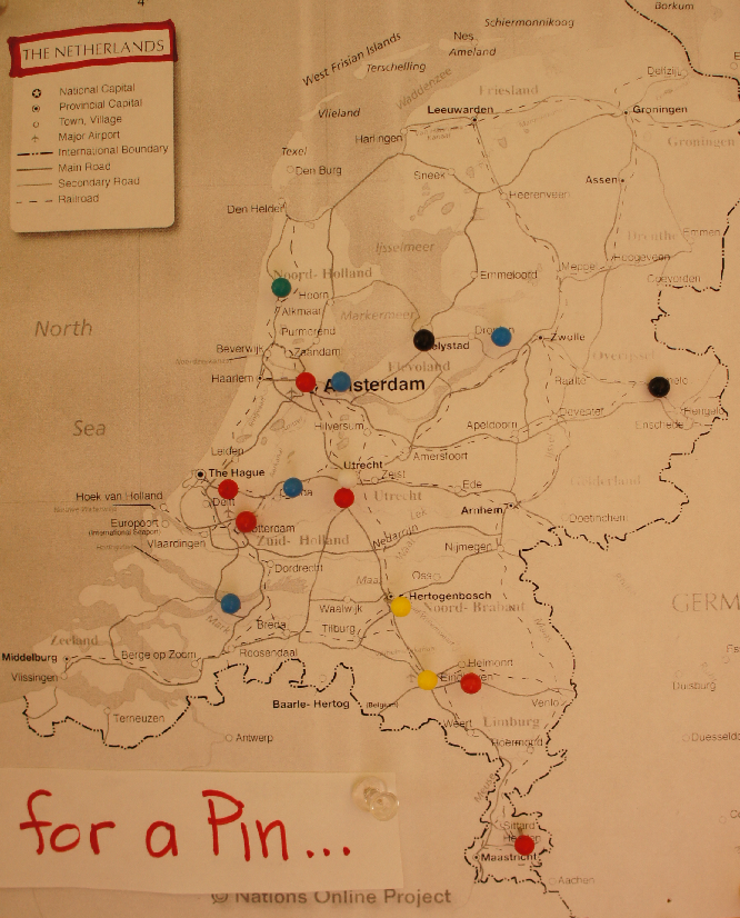 We rijden door naar Nederland waar we natuurlijk moeten stoppen bij het bord. We parkeren de auto en wandelen wat door het plaatsje heen. Natuurlijk gaan we naar het bezoekerscentrum waar ook wij aan het oosten van Rotterdam onze pin plaatsen. Op het forum had ik gelezen dat we hier geen uren kwijt zouden zijn toch vinden we Nederland zo’n grappig dorpje dat we hier toch nog meer dan twee uur rondgewandeld hebben. Bij de supermarkt doen we wat boodschappen zodat we dadelijk ergens langs de kant een picknick kunnen houden.