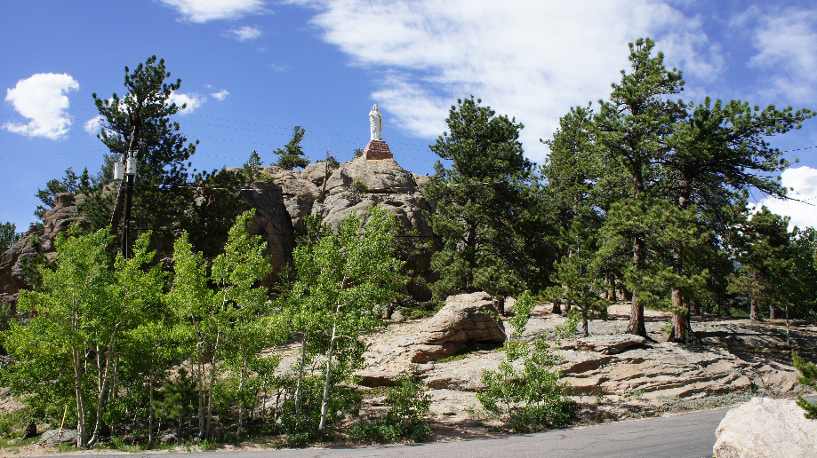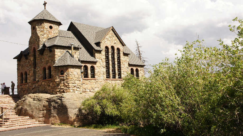 Aan de linkerkant van de weg duikt een kerkje op en het ligt er zo gigantisch mooi bij dat we dit natuurlijk nader moeten onderzoeken. Het blijkt de Chapel on the Rock te zijn. Officieel heet het St Catherine of Siena Chapel en het ligt dichtbij Allenspark. Paus Johannes Paulus II is hier geweest tijdens zijn bezoek aan Denver in 1993 en trots hangt een plaquette van deze gebeurtenis bij de deur. De kapel is rustig ingericht maar hierdoor vallen de bijzonderheden juist meer op. Prachtige ramen en een paar mooie beelden maken deze kapel zeer bijzonder. Tegenover de kapel is een mooi groot beeld van Jezus op de berg die naar de kapel kijkt.