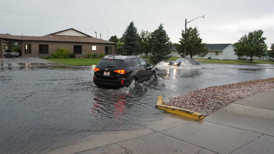 Nadat de bui een beetje is gaan liggen maken we wat foto’s van de plassen en spelen wat met onze auto en het water. Sommige auto’s rijden zo hard door de plassen dat het water hoger opspat dan hun auto hoog is.