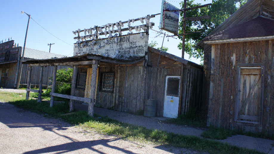 Ook hier zijn we niet lang bezig en gaan al snel weer op weg naar Badlands NP. Via de BIA Highway 27 rijden we zo een ghosttown in. Al is het niet helemaal een ghosttown want we zien een auto wegrijden achter een verlaten en verwaarloosd museum. Het huis vanwaar hij wegrijdt ziet er bewoond uit. Verder is het gehucht helemaal verlaten. Natuurlijk moeten we hier even snel wat foto’s maken.