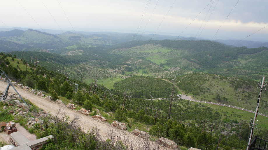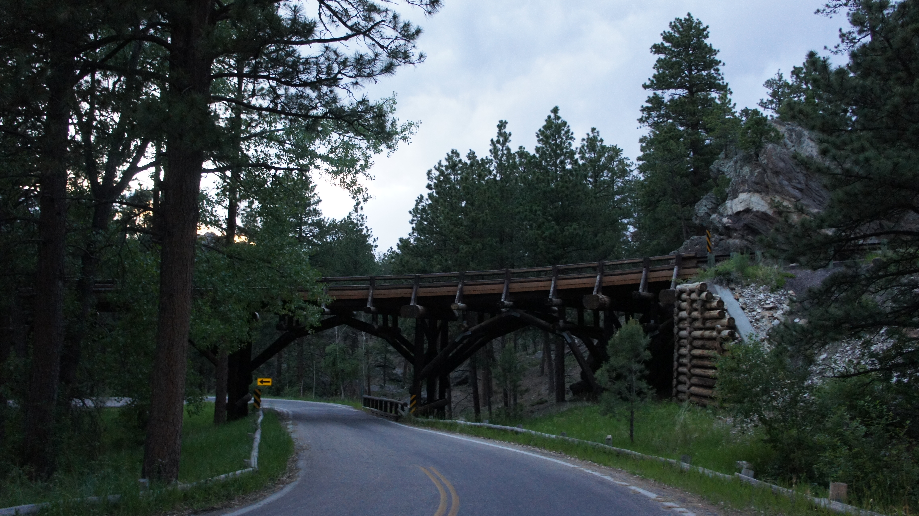 Als toetje na de maaltijd doen we de Iron Mountain . Na 9 hele smalle en bochtige kilometers door een bosrijk gebied te rijden, bereik je de noordoostelijke parkgrens. Het mooiste deel van de weg ligt buiten het park, je rijdt hier door drie hele smalle granieten tunnels waar maar net 1 auto doorheen kan. De smalste tunnel is net 4 meter breed. Als je door de tunnels heenkijkt, zie je in de verte de sculptuur van Mount Rushmore liggen. Echt een prachtig gezicht, ik heb het jammer genoeg niet echt op de gevoelige plaat gekregen zoals wij het gezien hebben. Behalve de tunnels kom je hier ook nog een aantal unieke bruggen tegen, de zogenaamde pigtail bridges. Dat zijn geheel uit hout gemaakte bruggen die in een bocht over de weg heen draaien, zodat over korte afstand een stuk hoogteverschil wordt overwonnen.