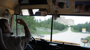 We maken een ritje met een bus naar de voet van het beeld. Gordy onze buschauffeur is een geweldige verteller en het is heel fijn om zijn verhaal aan te horen. Hij verteld hoe Koczak aan een touw hing om het paardenhoofd op de berg te schilderen met witte verf. Mrs Z. gaf instructies door de walkie talkie vanaf beneden en Koczak verfde de lijnen die het hoofd moesten voorstellen zodat de mensen het beeld zouden zien die hij voor ogen had. Ze hadden donaties nodig omdat hun eigen middelen al in de kruin zaten.