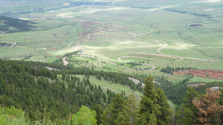 We rijden door leuke kleine plaatsjes en over landelijke weggetjes. Het is hier een stuk groener dan waar we vandaan komen en ook veel bergachtiger. De 14 gaat over in de 14 alt ook wel de Medicine Wheel Passage genoemd en is de meest bochtige route met de langste klim door de Bighorn Mountains. De weg klimt heel steil omhoog door groene bossen en rotsen. In de diepte zien we een meertje en een heuvellandschap waar hele mooie schaduwen op vallen. Bij de Bighorn National Forest Overlook stoppen we even en genieten even van het landschap en we volgen met onze ogen de weg die we net beklommen hebben. We stoppen bij de Moose Crossing Restaurant waar we heerlijk eten. De eetzaal ziet er geweldig uit met allerlei verschillende tafels gemaakt van mooi dennenhout. We vervolgen onze weg via de Alt 14.
