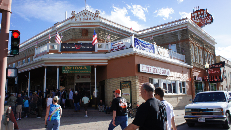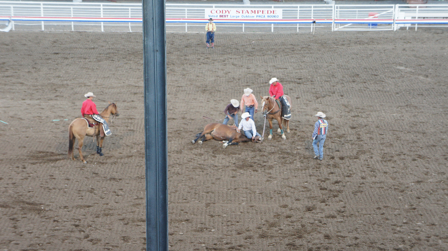 We rijden lekker door want we willen voor zessen in Cody zijn. Vanavond willen we naar de rodeo net buiten Cody. De Cody Nite Rodeo het lijkt ons leuk dat eens mee te maken. De poorten gaan open vanaf 7 uur en om 8 uur begint de Rodeo. Ruim op tijd zijn we in Cody. We checken in en gaan op zoek naar de plek waar de Rodeo gehouden wordt. Het is ongeveer op 1600 meter van ons hotel. De kaartenverkoop is nog niet begonnen, we besluiten om het dorp dan maar even te bezichtigen. Voor het Irma Hotel, dit hotel is door Buffalo Bill Cody gebouwd, zijn ze bezig met een of andere cowboy show. Iedere avond om 18.00 uur begint het wanneer wij er om 18.30 uur zijn is het nog steeds volop aan de gang. Je kunt voor $2,– een stoeltje huren op de voorste rij. De stoeltjes zijn allemaal bezet dus die doen het goed. Heel veel mensen zitten ook gewoon op de grond en staan er omheen.