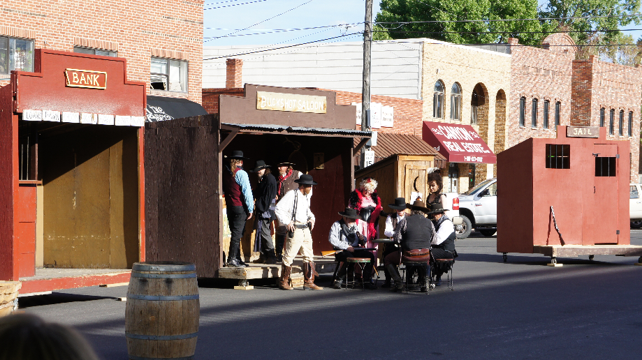 Het is wel grappig om te zien, vrijwilligers voeren een toneelstukje op met veel schietwerk. Ze maken een dansje met het publiek en dan gaat het toneelstukje weer verder. Na een kwartiertje houden wij het voor gezien. We wandelen wat door de hoofdstraat van Cody. Na ongeveer tien minuutjes besluiten we unaniem dat we Cody niet zo leuk leuk vinden. Het komt wat nep over. Al snel gaan we weer naar de Rodeo om kaartjes te kopen en om ons om te kleden voor het geval het koud wordt. We kunnen ons niet voorstellen dat het zo veel gaat afkoelen dat we het koud gaan krijgen maar voor het geval dat, doen we een spijkerbroek aan en nemen we een trui mee. Een fleece deken heb ik in mijn rugtas gegooid.