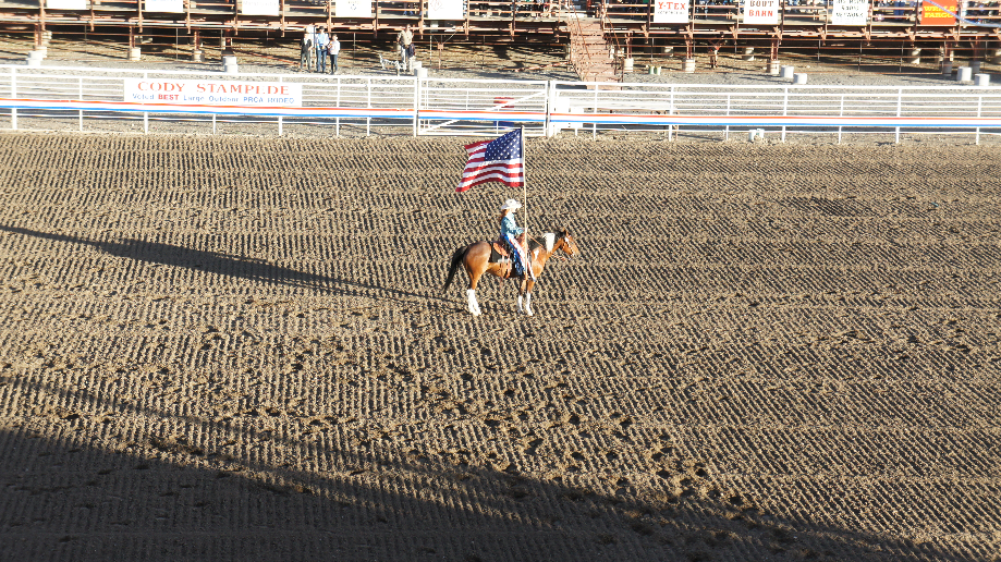Terwijl wij de tribune oplopen begint het. The Grand Entry. Nota bene met gebed! Iedereen buigt het hoofd en bid voor de ruiters en de dieren. Na het gebed gaan ze allemaal snel staan want er komt een ruiter binnen met de Amerikaanse vlag en wordt het Amerikaanse Volkslied gezongen. Alle cowboyhoeden zijn af en we volgen allemaal trouw met onze ogen de vlag.