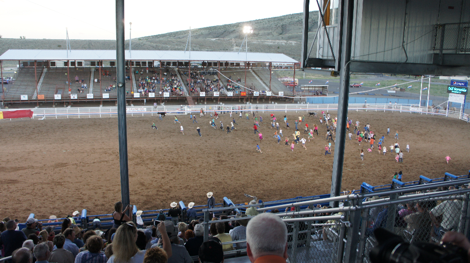 Op een gegeven moment mogen alle kinderen onder de 12 in de arena komen. Het stroomt vol met kinderen. Na een kletspraatje van de clown komen er 2 kalfjes met een lint in hun staart binnen. Wie het lint pakt heeft een prijs. De eerste prijs is een uurtje paardrijden en een ijsje bij de Dairy Queen en de tweede prijs alleen een ijsje. Leuk om te zien want ze zijn zo lekker fanatiek al die kinderen.