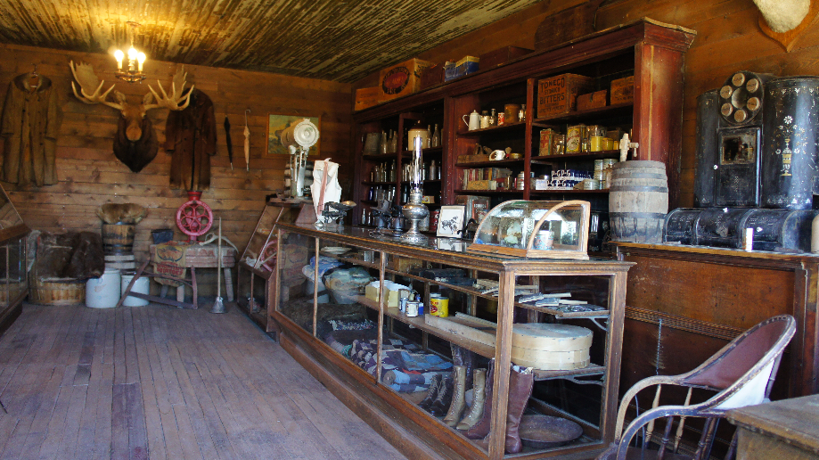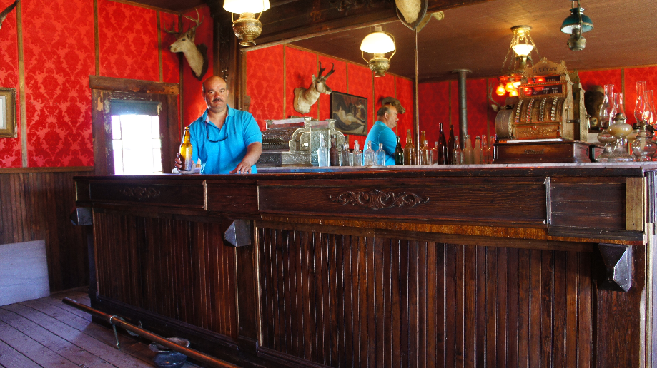 Over een vlonder loop je langs de gebouwen. Door de deuren en ramen kun je naar binnen kijken. De meeste gebouwen zijn in oude staat ingericht, zoals een winkel, woonkamer, apotheek, schooltje, vooral de saloon vinden wij erg leuk. Terwijl Car ons wat te drinken inschenkt speelt Dani wat op de piano.