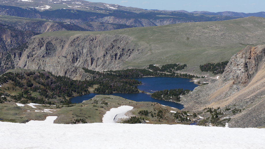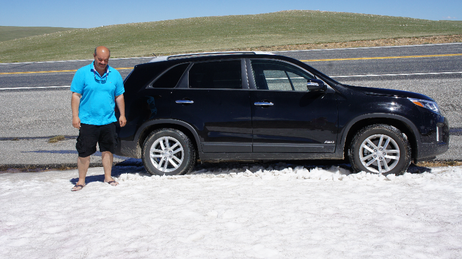 Wanneer we uiteindelijk voor ons gevoel de top bereikt hebben, stoppen we even om de omgeving in ons op te nemen. Het is niet eens zo zeer dat het mooi is, want we zijn boven de bomengrens. Op deze hoogte hebben we niet eens meer dennenbomen. Het is vooral grijs en het groen wat we zien is volgens mij een soort mos. Er staat een man, voor ons gevoel, in de sneeuw veel te dicht bij de rand een foto te nemen. Een verkeerde beweging en die man glijdt zo de afgrond in. Hij zal heus wel weten wat hij doet, maar het is voor ons, toeschouwers, geen fijn gezicht om dit te zien. Het was even een omweg om van Cody via Red Lodge naar Yellowstone te rijden. De Beartooth Highway is een geweldige mooie route en zeker al die extra kilometers meer dan waard.