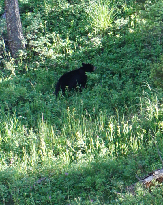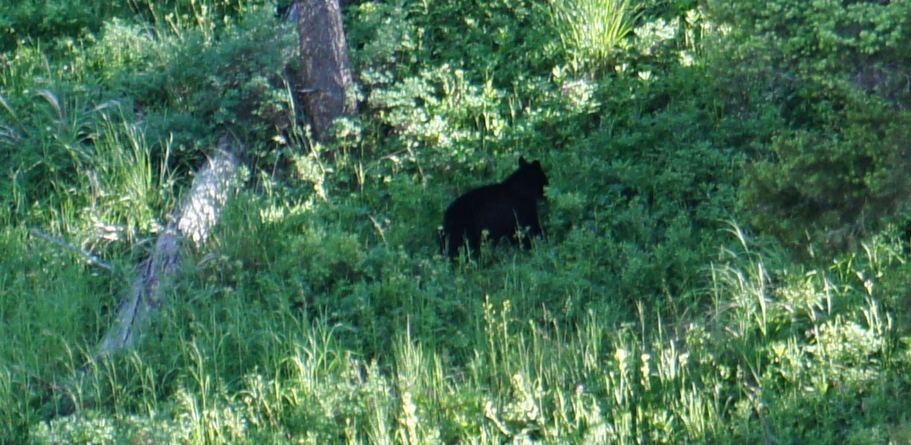 Bij Tower-Roosevelt slaan we linksaf richting Canyon Village, hier slapen we vannacht. Op deze weg hebben we last van wegwerkzaamheden. Al snel zien we ook hier weer mensen langs de kant met al hun apparatuur de berg op kijken. Ook wij stoppen en al snel horen wij dat er een zwarte beer zit. Jippie, we zijn helemaal gelukkig want we hebben onze eerste beer in het wild gezien. Ook nu baal ik dat ik geen betere lens heb, maar ik heb hem of haar wel vast kunnen leggen. Het is zo stom maar je bent zo blij dat je eindelijk echt een wild dier hebt gespot in zijn natuurlijke omgeving. We doen ook niet anders dan turen door de bomen om wolven en beren te kunnen spotten.