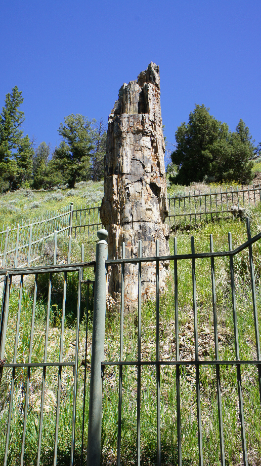 We besluiten dat we eerst terugrijden naar het noorden want dan hebben we de 16 km wegwerkzaamheden nu achter de rug. Beter dan vanavond wanneer we moe zijn of eventueel wanneer het donker is. Het zit ons heel erg mee, zodra wij aan komen rijden mogen we gelijk doorrijden. Bij Tower slaan we af naar links en al snel maken we onze eerste stop bij de Petrified Tree. Dit is een versteende boom. Er waren begin twintigste eeuw drie van dit soort bomen. Souvenir jagers hebben deze bomen stukje voor stukje meegenomen. De overgebleven boom wordt nu beschermd door een groot ijzeren hek.