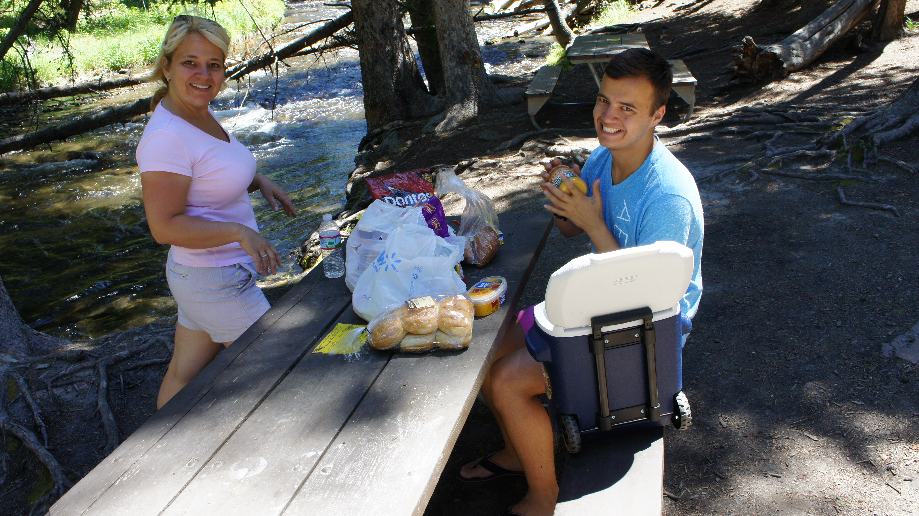We rijden weer verder richting Mammoth Springs en stoppen bij Wraith falls om te picknicken. Het perfecte plekje. Tafeltje met bankjes onder een boom langs de rivier, beter kan niet.