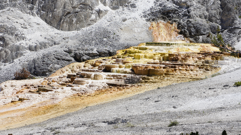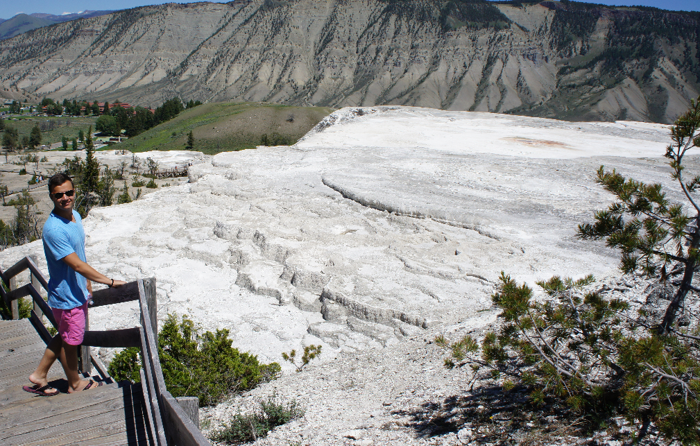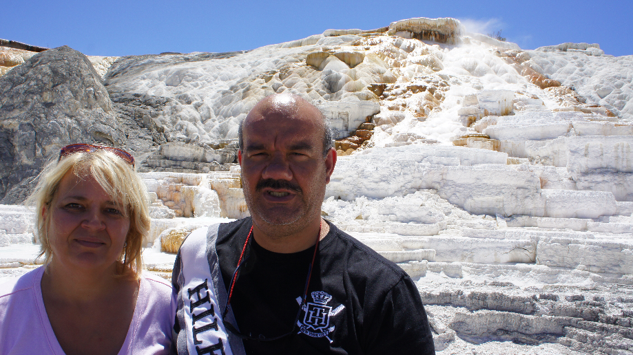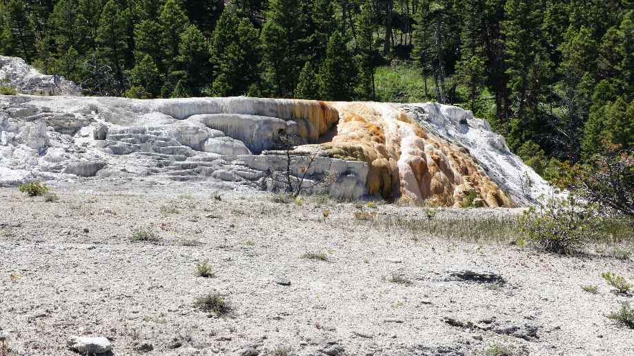 Na het eten komen we al snel aan bij Mammoth Hot Springs. Dit is een leuk gehucht. Er is een mooie kapel en er zijn ook privé woningen. We rijden naar het parkeerterrein van de terrassen. Het lage terras is gemakkelijk te bewandelen maar natuurlijk wil ik ook de hogere terrassen zien. Daan en ik besluiten om Car ons naar de top te laten rijden en dan samen naar beneden te wandelen waar Car ons weer opwacht bij het parkeerterrein. Zo gezegd zo gedaan. Wat is het hier mooi. Al die verschillende kleuren die gecreëerd worden door verschillende micro-organismen.