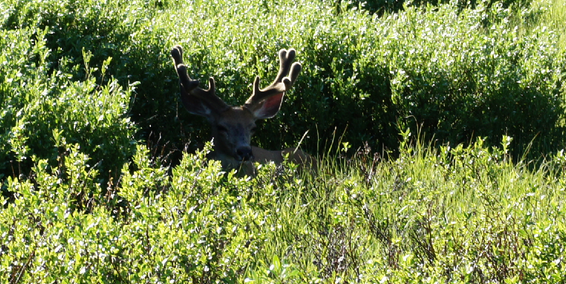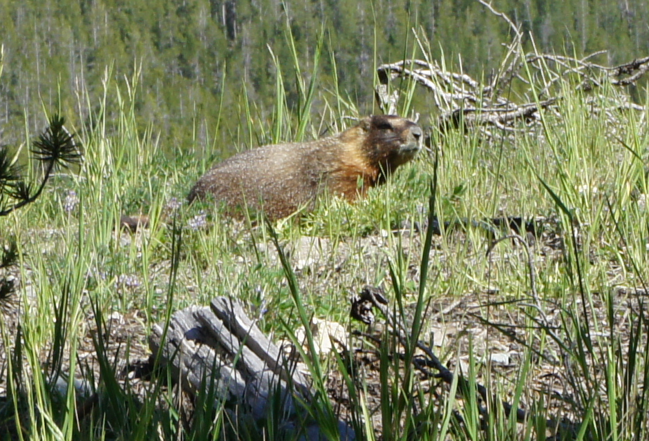 We verlaten de Canyon, het wordt tijd om naar het hotel te gaan en wat in onze maagjes te manoeuvreren. Vandaag slapen we in Grant Village. Dit ligt helemaal in het zuiden van Yellowstone. We rijden naar het zuiden naast de Yellowstone River en wanneer de rivier ophoudt begint het Yellowstone Lake. Het is een hele mooie weg natuurlijk wordt er door ons niet veel naar het water gekeken. We turen alleen maar tussen de bomen op zoek naar een beer. Jammer genoeg hebben we die niet meer gezien. We kwamen onderweg nog wel een rendier tegen. Zij lag zo lekker tussen de struiken te genieten van het zonnetje.