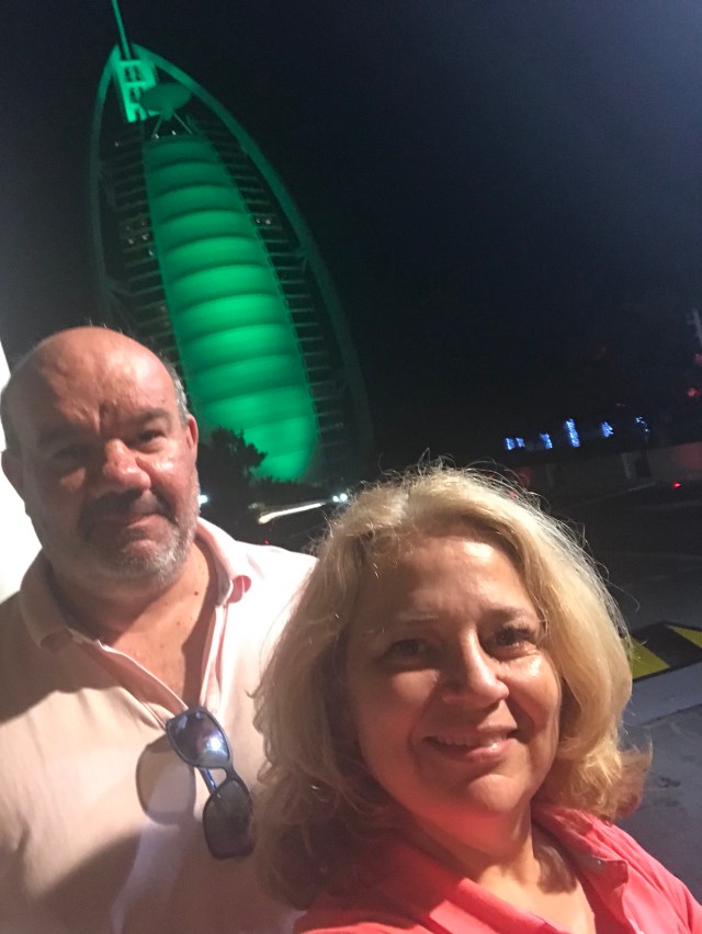 We stoppen nog even voor een foto stop bij de Burj Al Arab die mooi verlicht is in de lievelingskleur van mijn kleinzoon.